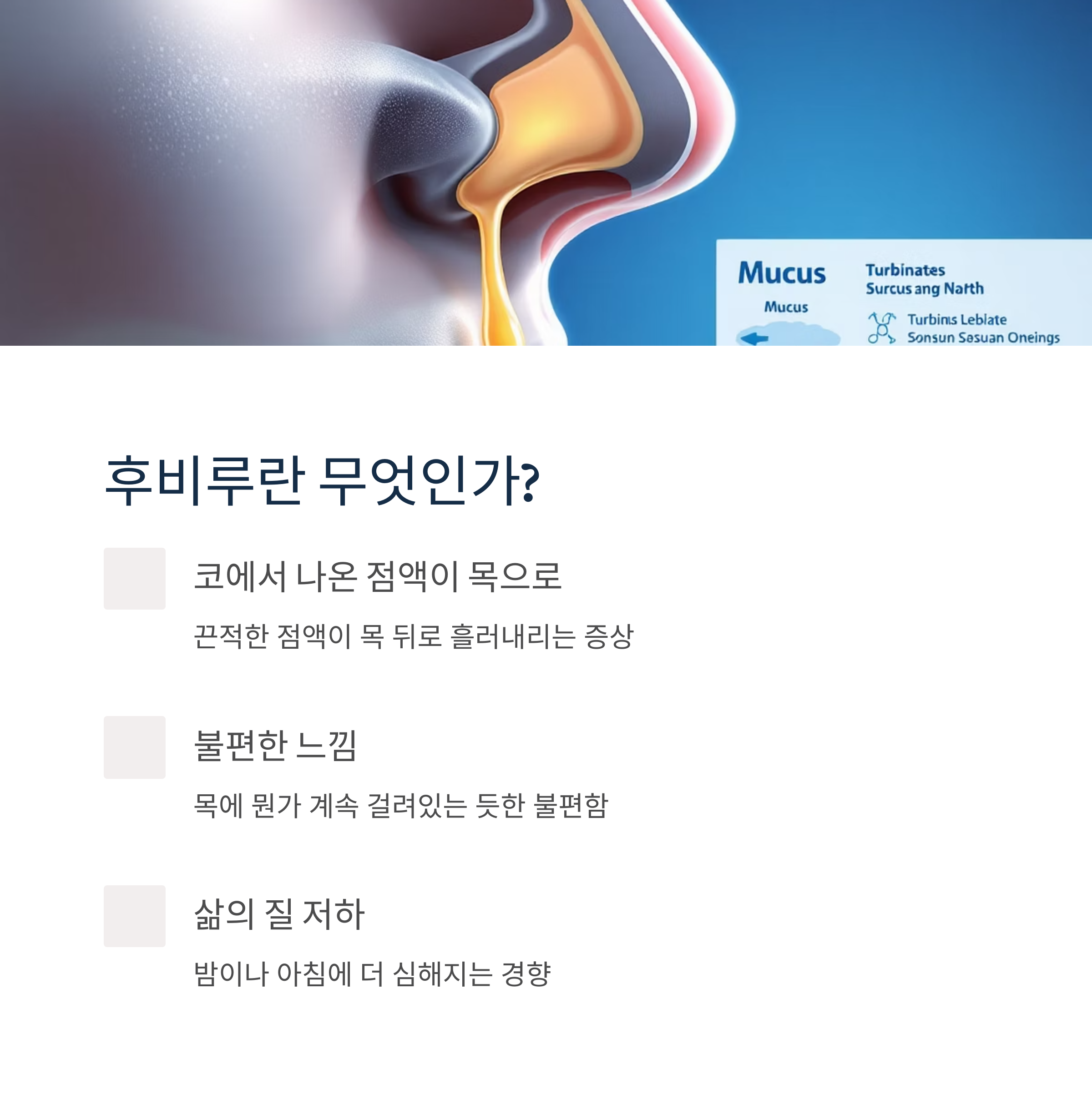 후비루는 단순한 불편함을 넘어서, 삶의 질을 떨어뜨릴 수도 있으니 가볍게 생각하면 안 되겠죠? 후비루의 원인을 알고, 증상에 맞는 관리를 해야 해요. 이제부터 후비루의 비밀을 하나씩 풀어볼까요?