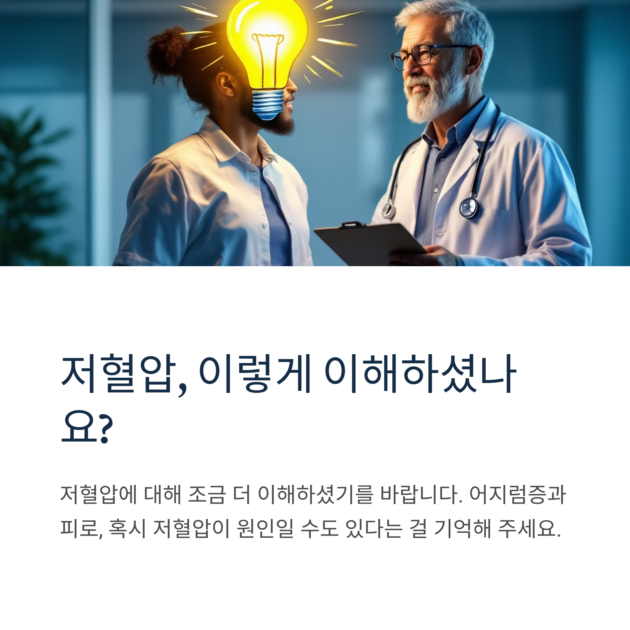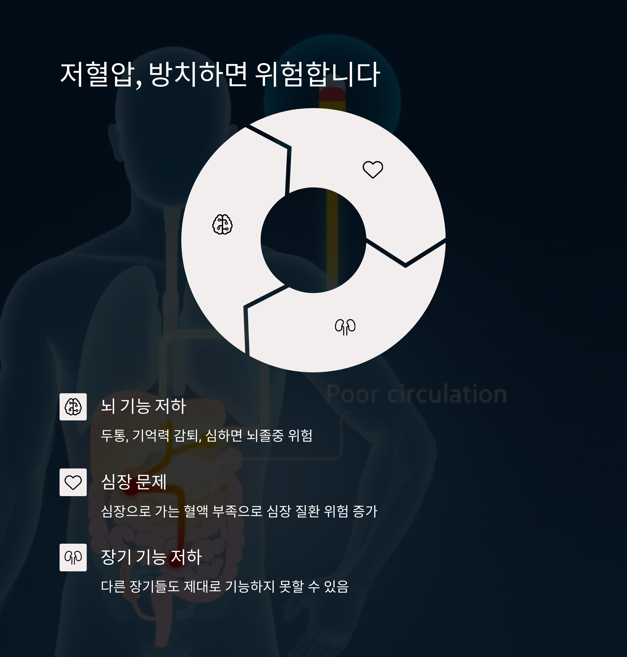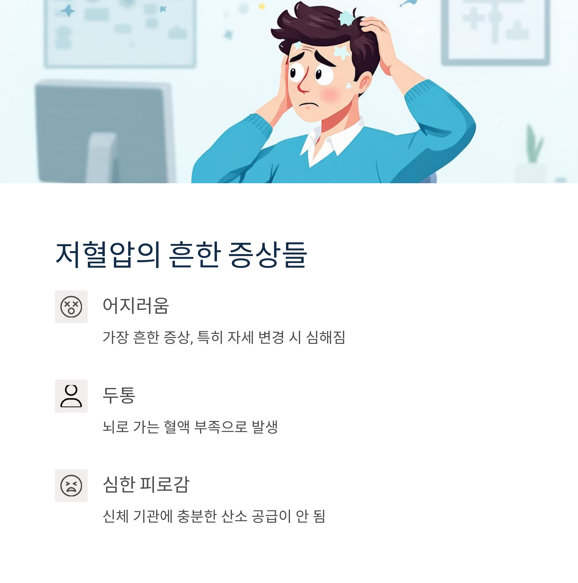 하지만 혈압이 낮아서 몸에 필요한 혈액 공급이 원활하지 않으면 어지럼증이나 두통, 심하면 실신까지 이어질 수 있으니 주의해야 합니다. 저혈압은 단순한 숫자의 문제가 아니라, 우리 몸이 제대로 기능하지 못하는 신호일 수 있다는 걸 기억해주세요.