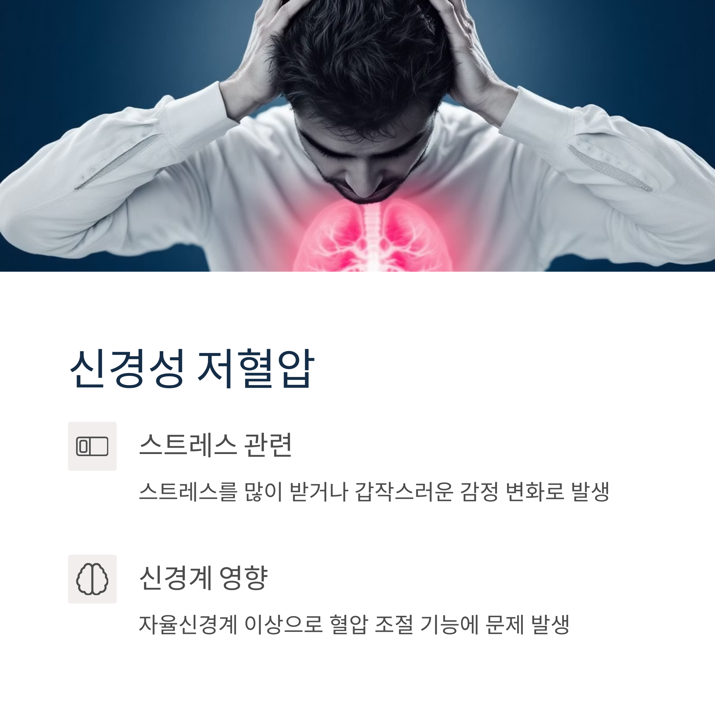 식사 후 혈압이 떨어지는 '식후 저혈압'도 있고, 스트레스를 많이 받거나 갑작스러운 감정 변화 때문에 생기는 '신경성 저혈압'도 있어요. 심장병이나 갑상선 질환 등 다른 질병 때문에 생기는 경우도 있고, 심지어는 복용하는 약물 때문에 저혈압이 생길 수도 있답니다.