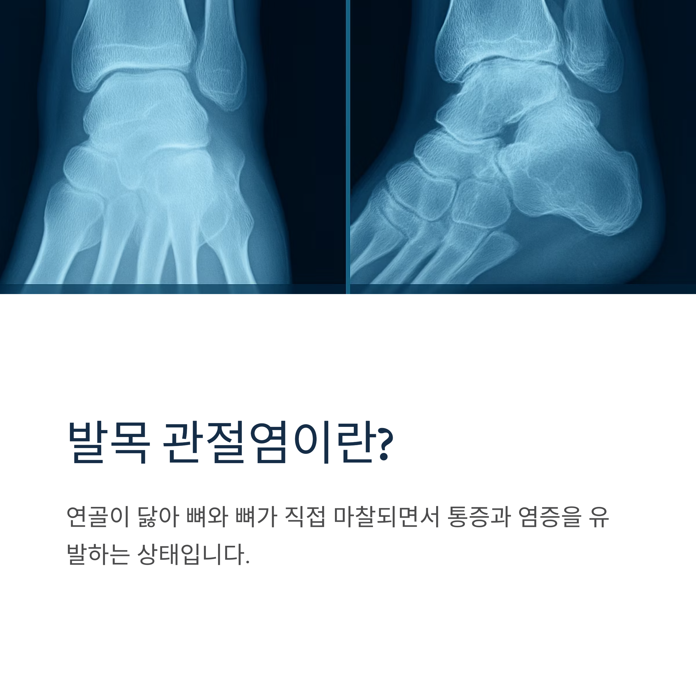 골절은 외부 충격에 의해 뼈가 부러지는 것이고, 미세 골절은 작은 균열이 생긴 경우인데, 둘 다 발목 통증을 유발합니다. 만약 뼈나 연골에 문제가 있다면, 통증을 줄이고 관절의 기능을 유지하기 위한 치료가 필요합니다. 물리치료, 약물 치료, 그리고 경우에 따라 수술이 필요할 수도 있고요. 뼈와 연골 건강을 위해서는 칼슘과 비타민 D 섭취를 충분히 하고, 적절한 운동과 체중 관리가 중요합니다.