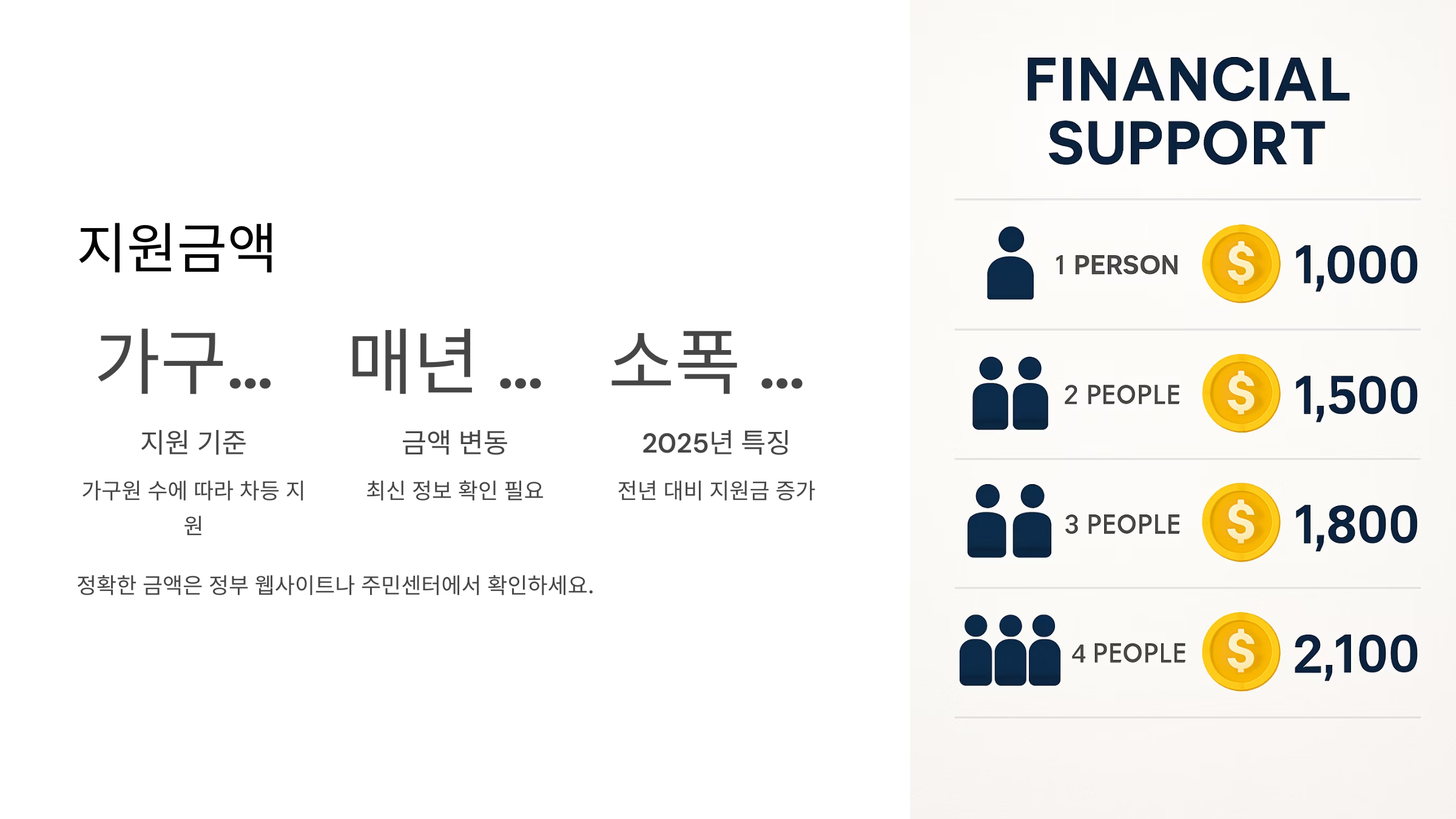 지원금액은 가구원 수에 따라 다르며, 정확한 금액은 매년 조금씩 달라질 수 있습니다. 최신 정보는 정부 웹사이트나 주민센터에서 확인하실 수 있습니다. 지원금은 가상 카드와 실물 카드 중 선택해서 받을 수 있습니다.