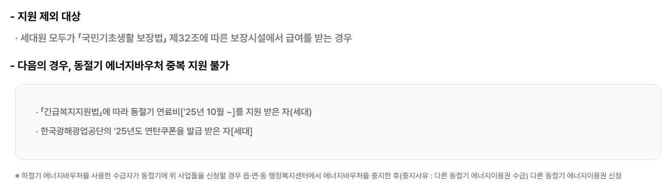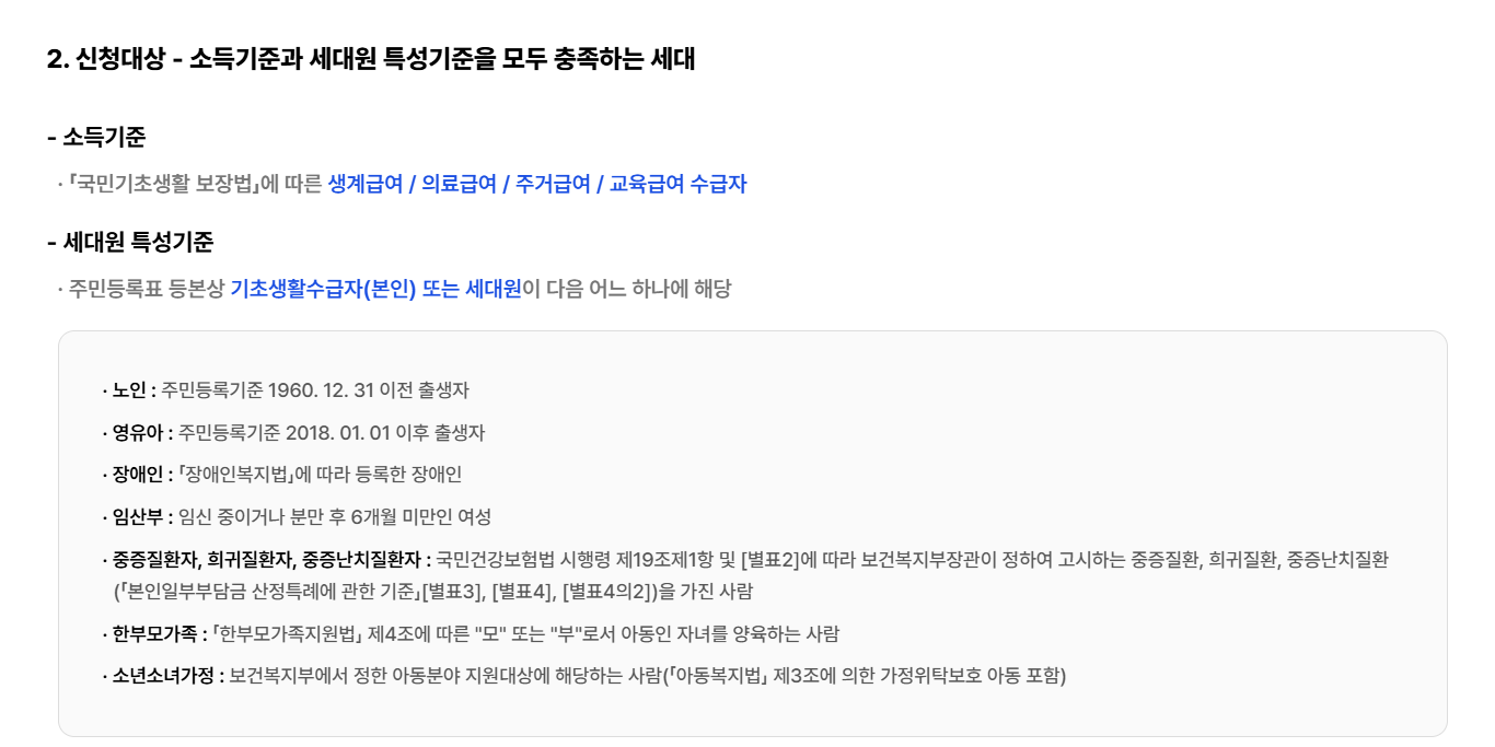 이 지원사업은 모든 분들이 받을 수 있는 것은 아닙니다. 기초생활수급자 중 하나에 해당해야 하고, 세대원 중에 만 65세 이상 어르신, 만 6세 이하 영유아, 장애인, 임산부, 희귀·중증 질환자 등 특별한 지원이 필요한 분이 계셔야 합니다.