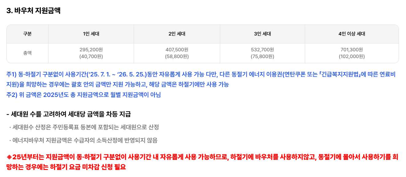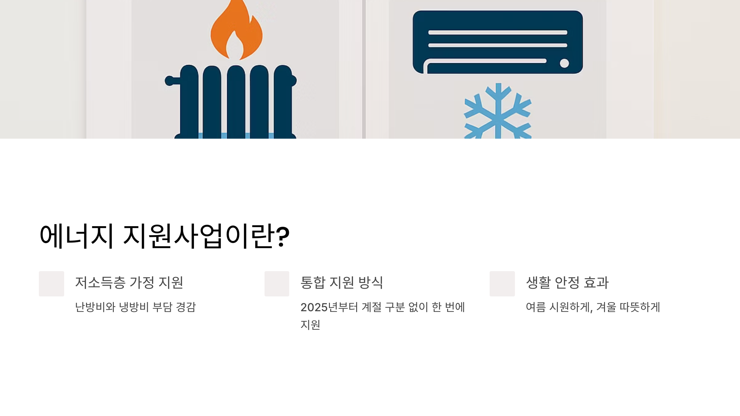 바로 '에너지 지원사업'인데요. 예전에는 여름과 겨울, 계절별로 나눠서 지원했지만, 2025년부터는 계절에 상관없이 한 번에 지원받아 여름에는 시원하게 에어컨을 틀고, 겨울에는 따뜻하게 난방을 할 수 있도록 바뀌었습니다.