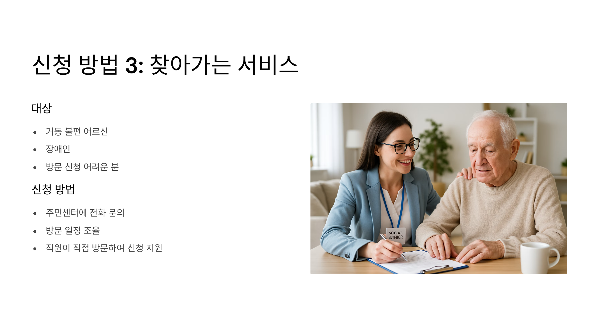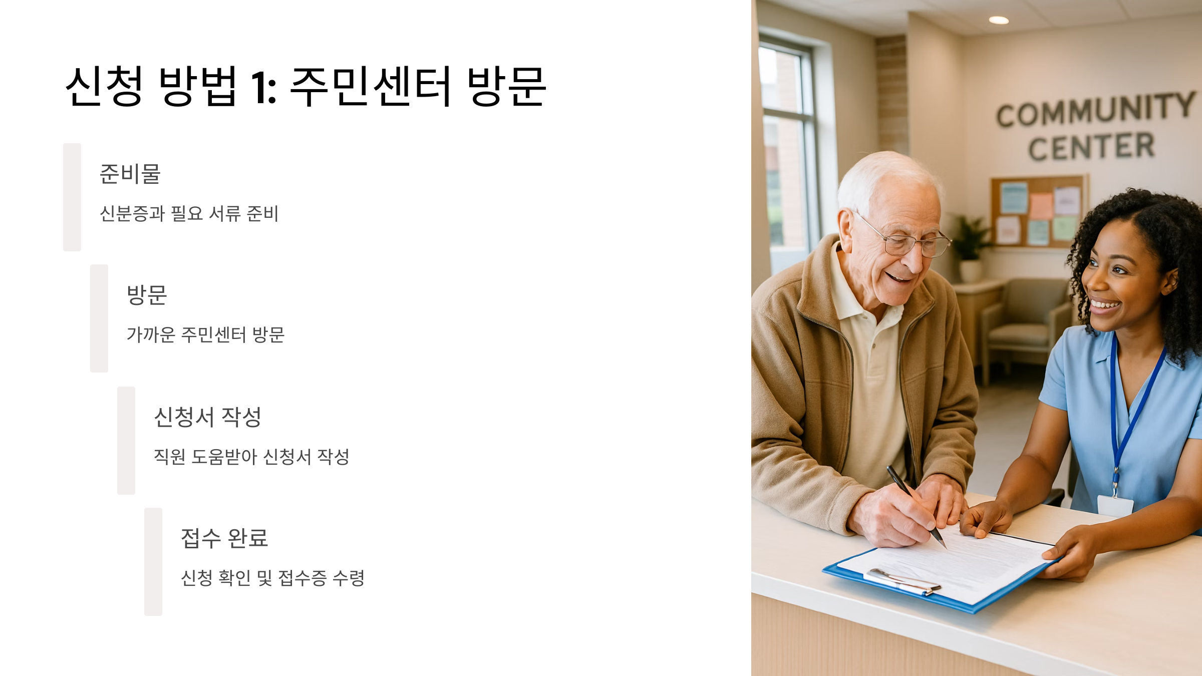 주민센터에 문의하시면 직원분들이 직접 방문하여 신청을 도와드립니다. 어떤 방법을 선택하든 편리하고 빠르게 신청하실 수 있도록 최선을 다하겠습니다. 가장 편한 방법을 선택해서 신청해보세요!