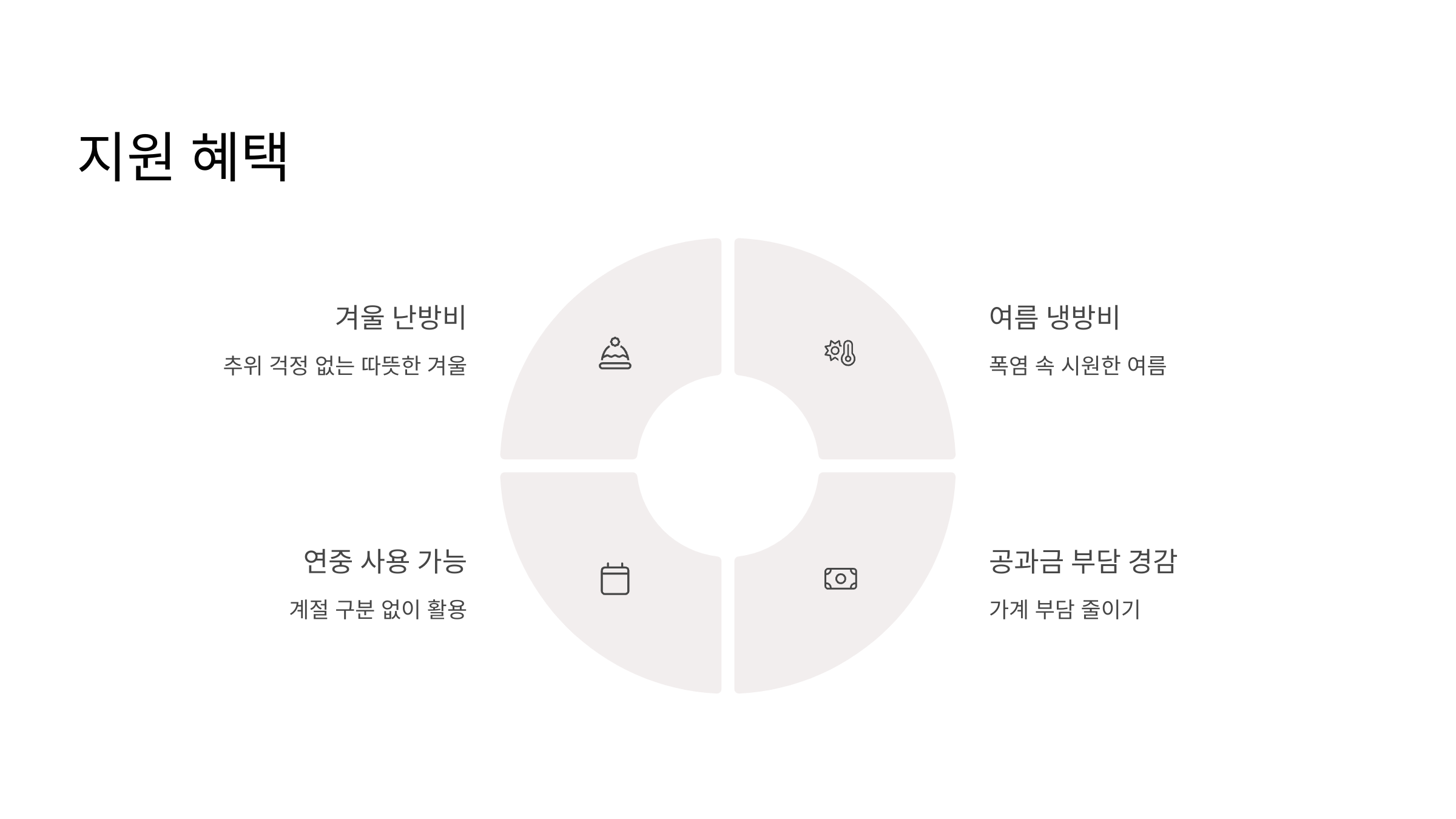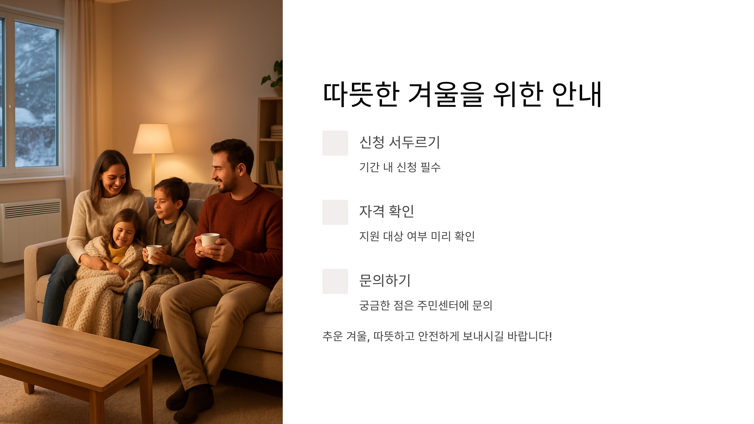 더 이상 겨울 추위에 떨거나 여름 더위에 지칠 필요가 없어요! 이 사업 덕분에 따뜻하고 시원한 생활을 유지하는 데 도움을 받을 수 있습니다. 마치 든든한 겨울 이불처럼 여러분의 겨울을 따스하게 만들어 줄 거예요. 이 지원금으로 좀 더 편안하고 안전한 겨울을 맞이하실 수 있기를 바랍니다.