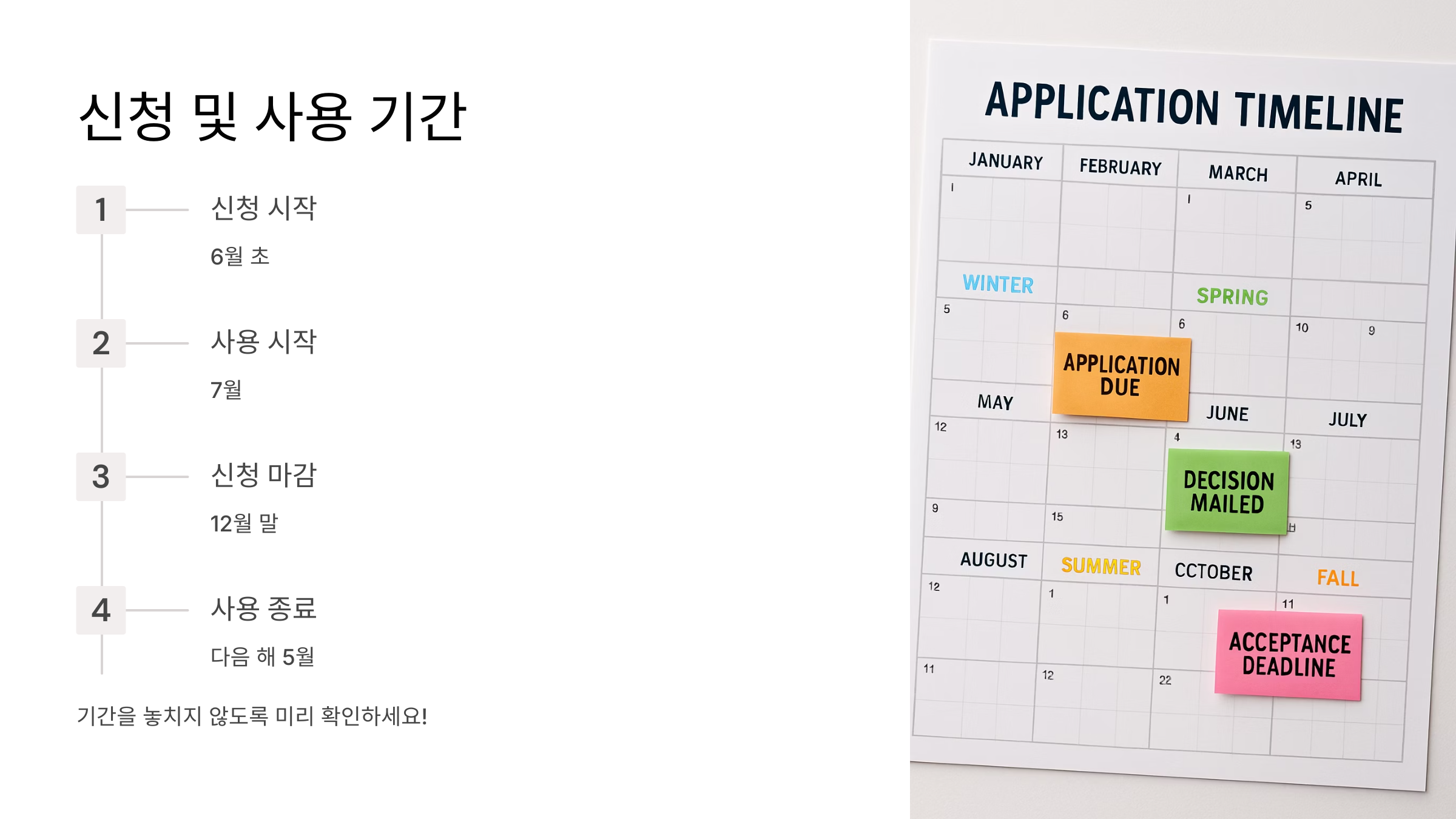 만약 여러분 가족 중에 해당되는 분이 있다면 꼭 신청해보세요. 신청 기간은 보통 6월 초부터 12월 말까지이며, 사용 기간은 7월부터 다음 해 5월까지입니다. 기간을 놓치지 않도록 미리미리 확인하시고, 자격 요건에 해당하는지 꼼꼼하게 확인하는 것이 중요해요.