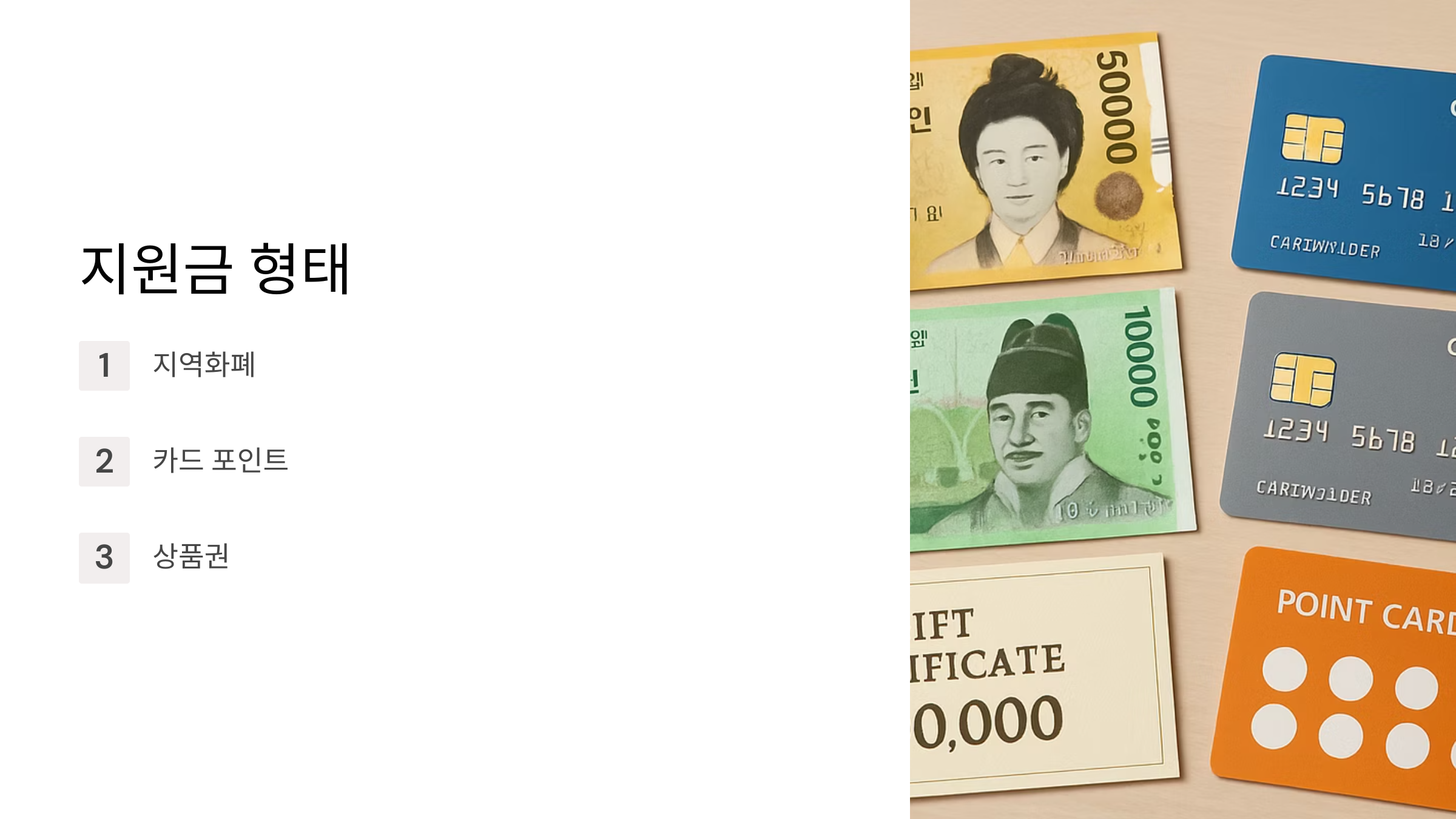 지원금의 종류가 여러 가지일 수 있다는 점을 아시나요? 지역화폐나 카드 포인트, 상품권 등 다양한 형태로 지원금이 지급될 수 있다고 해요. 지역마다 조금씩 다를 수 있으니, 내가 사는 지역의 지급 방식을 미리 확인해 두는 것이 좋겠죠?